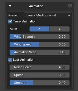 Noise Scale - This will determine how big the noise texture distorting the leaf movement is. A higher value will create more gradual slower appearing movement, while a lower value will create quicker movements in smaller sections.