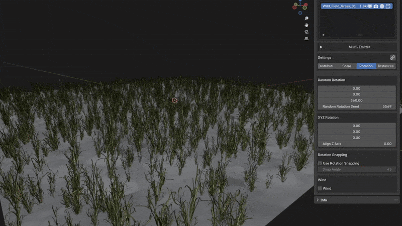 Random Rotation adds variation by randomly rotating instances on one or more axes. This helps eliminate obvious repetition and makes your scatter system feel more natural