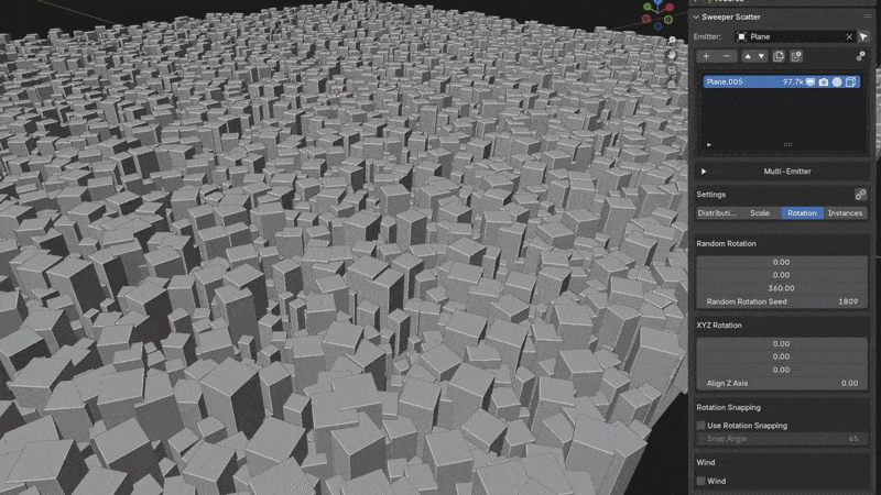 Rotation Snapping allows you to restrict instance rotation to specific degree increments. This is useful when you want more structured or controlled scattering like when scattering architecture.
