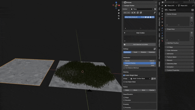 With Arborea, you can use multi-emitter scattering to apply a single scatter system across multiple objects or terrain pieces at once. This makes it easy to manage large environments while keeping everything unified under one system.